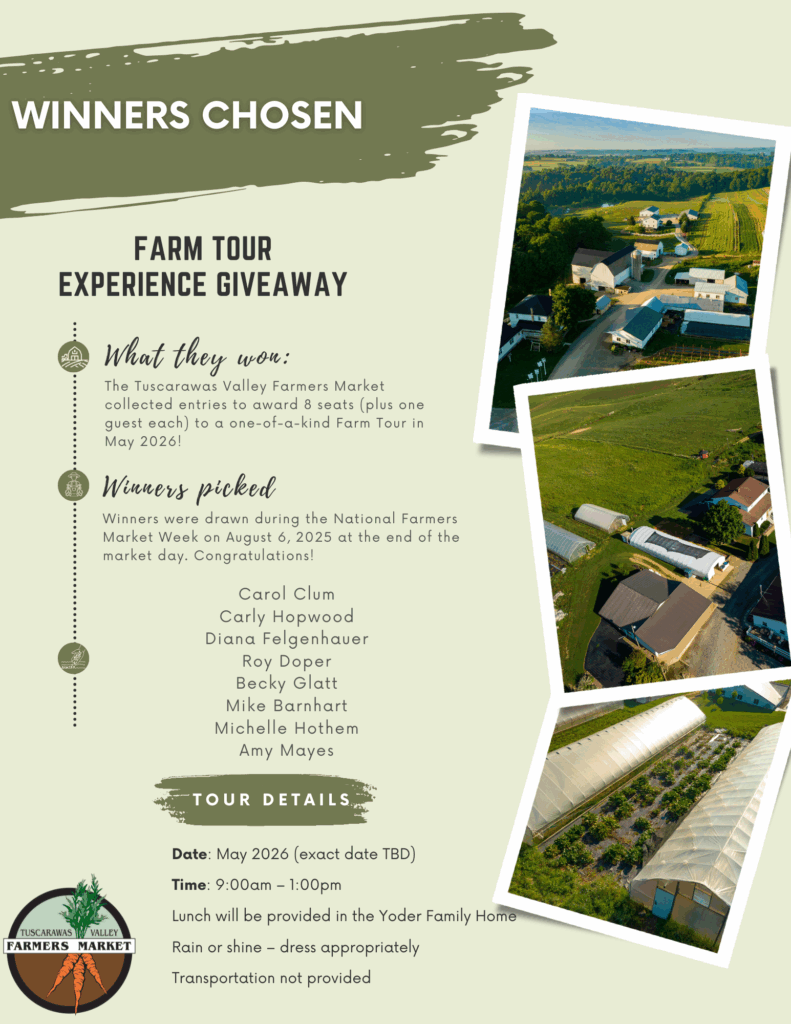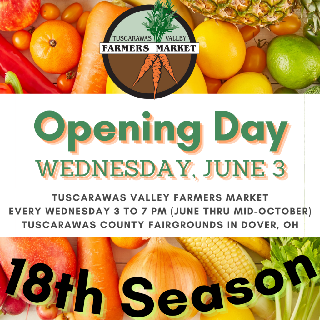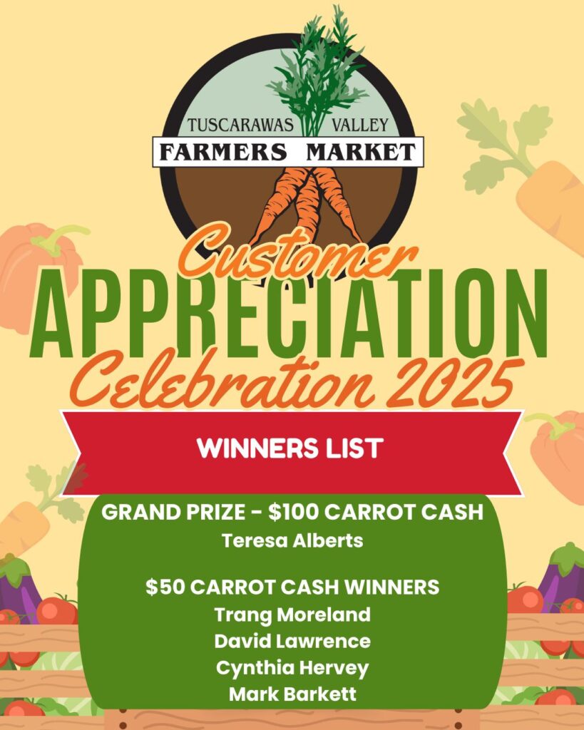 As we look towards the future of the market, we are interested in hearing your thoughts about how we can continue to serve the community’s needs. Please take a few moments to answer our Patron Survey and help shape the future of the Tuscarawas Valley Farmers Market. We appreciate your participation!
